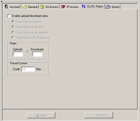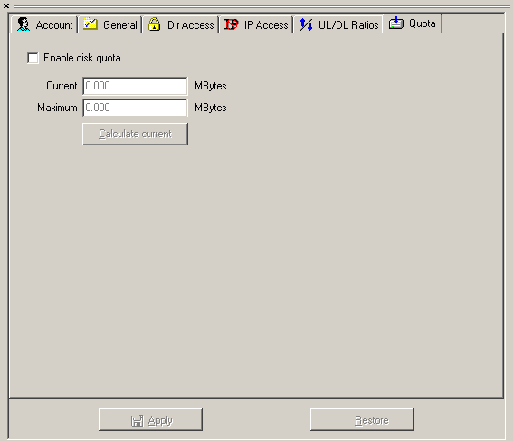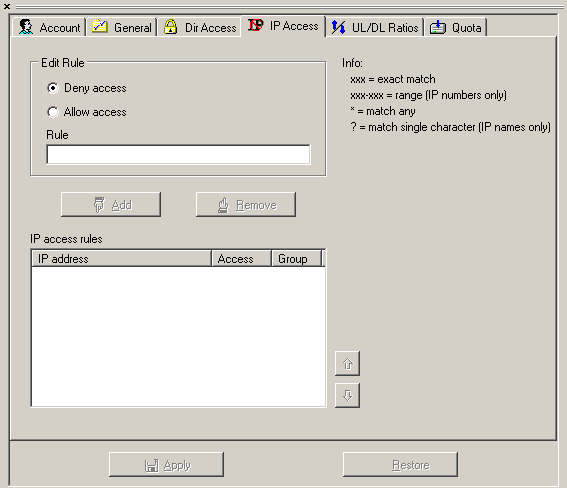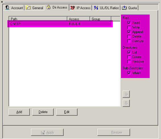 Pasamos entonces a la pestaña "Dir Access" donde le daremos los permisos necesarios a los usuarios. Los permisos basicos que un